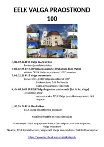 - T, 3. kl 17.30 Näituse “EELK Valga praostkond 100” avamine Valga muuseumis